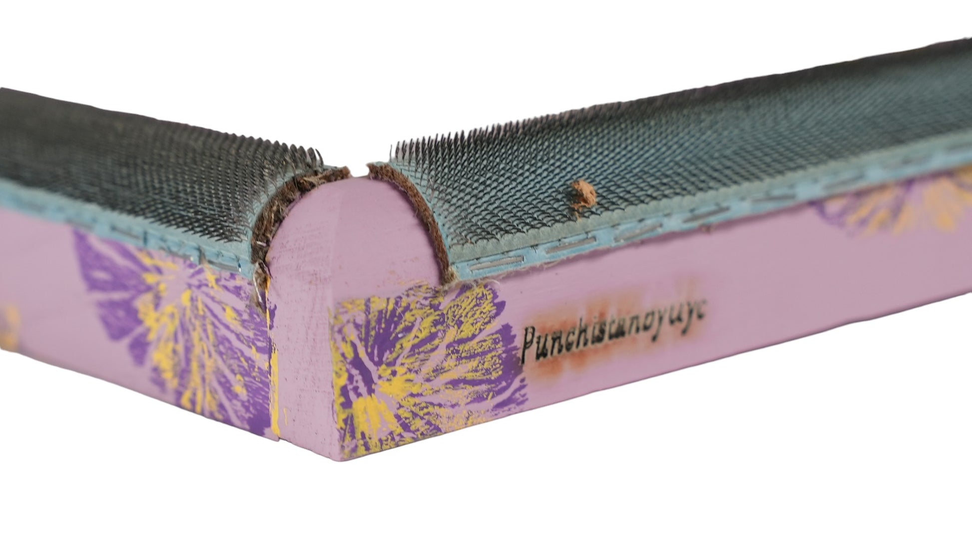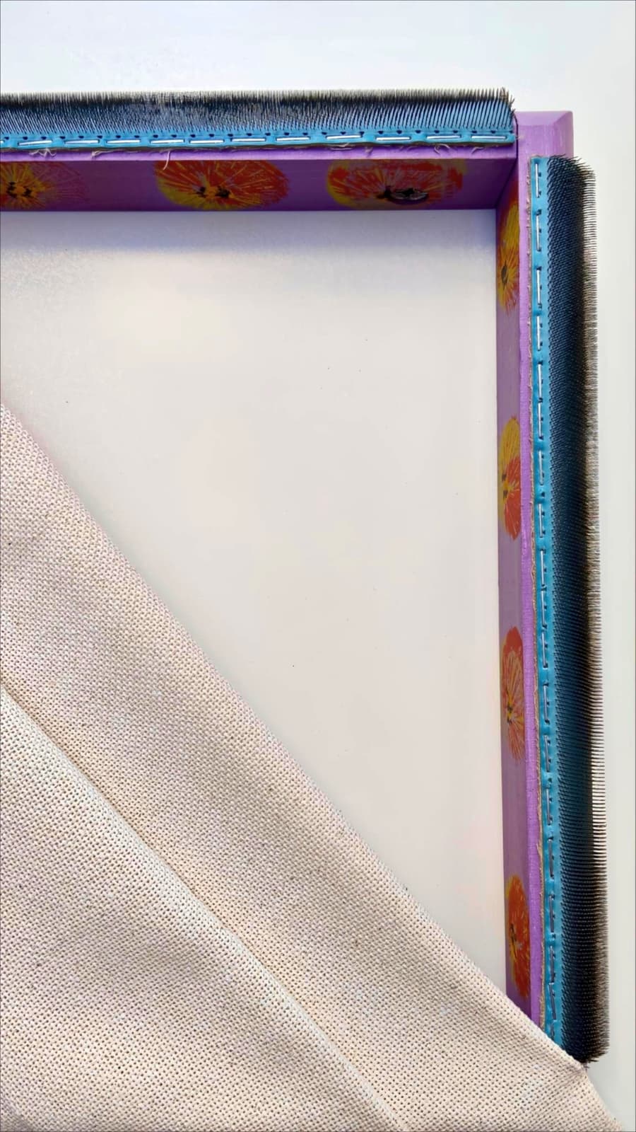 Kasnaklarımızda kumaş tutucu olarak iğneli şerit kullandık.; İsviçre çeliğinden imal edilmiş olan 480PPSI sivri ve eğimli çelik iğneli tutucu şeridi optimum tutma açısıyla kasnağımızın kenarına çaktık. (Tutucu iğneli şeritler geri dönüşüm malzemesidir. )