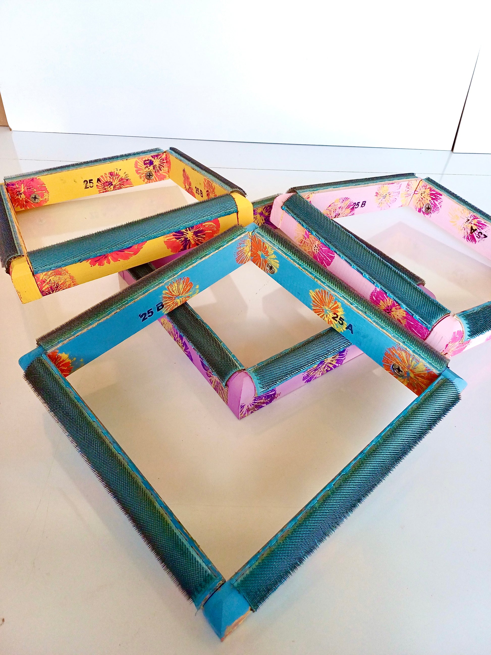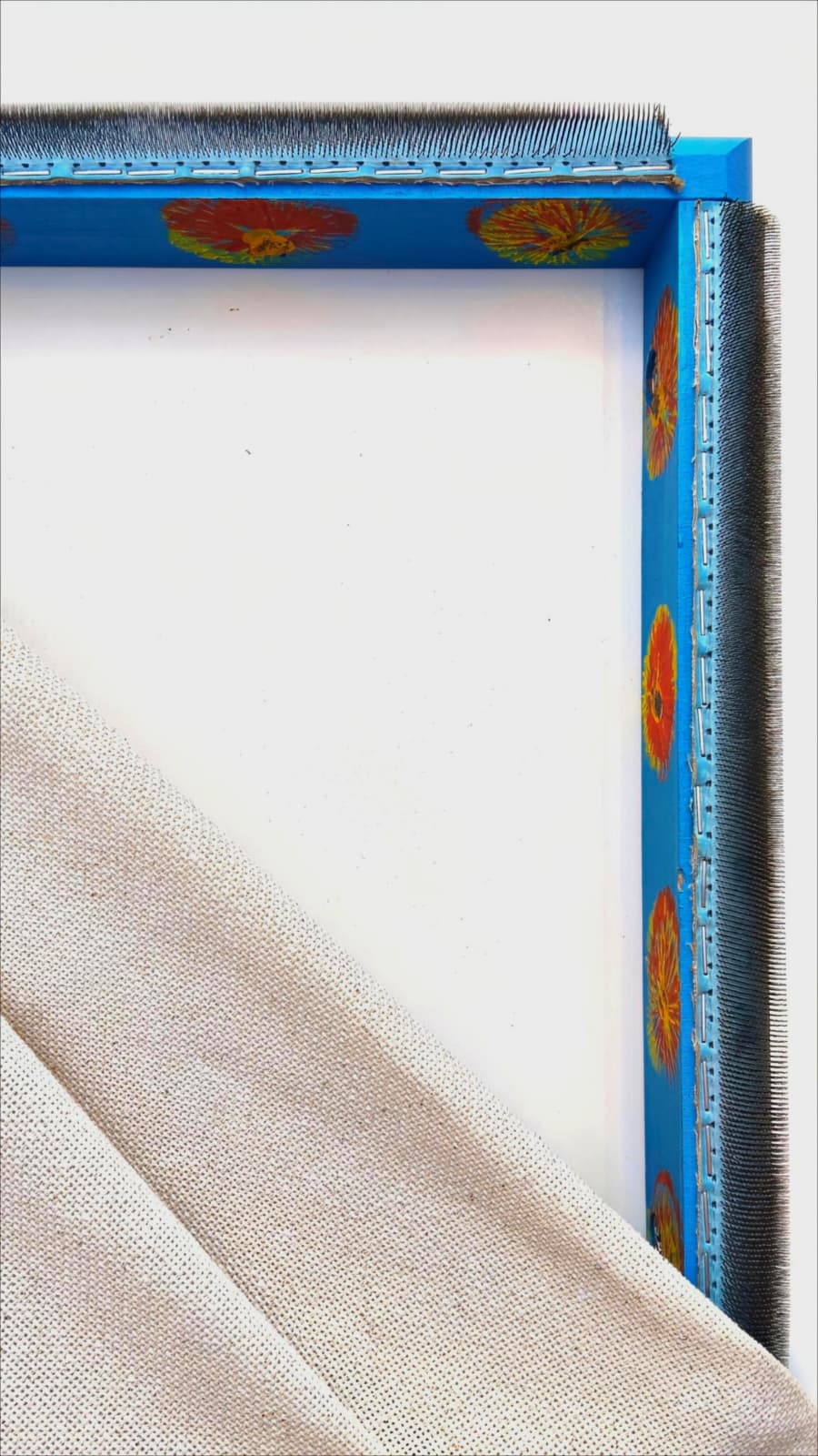 Kasnaklarımızda kumaş tutucu olarak iğneli şerit kullandık.; İsviçre çeliğinden imal edilmiş olan 480PPSI sivri ve eğimli çelik iğneli tutucu şeridi optimum tutma açısıyla kasnağımızın kenarına çaktık. (Tutucu iğneli şeritler geri dönüşüm malzemesidir. )